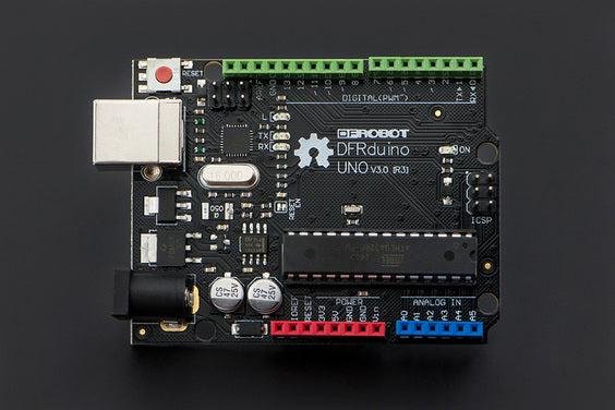 The DFRduino UNO R3 Kit includes the DFRduino UNO R3, Gravity: IO Expansion Shield, and a USB Cable A-B. This compact microcontroller board from DFRobot is ideal for academics and development purposes. Fully compatible with the Arduino UNO R3 and the Arduino IDE, it supports the Processing/Wiring language and can be used to create stand-alone interactive objects or connect to various software on your computer.
