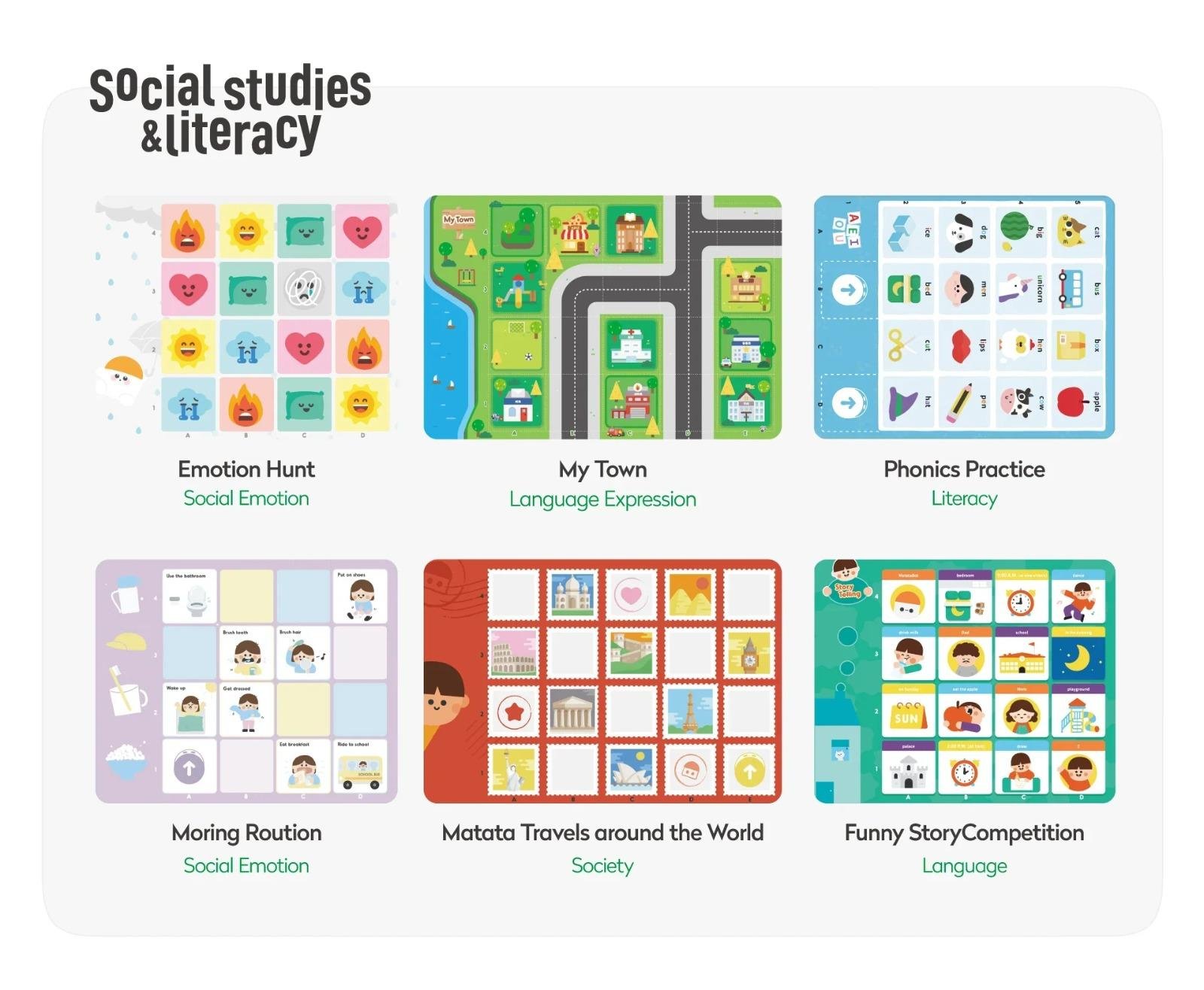 With 3 double-sided maps featuring 6 captivating themes, this set provides an exciting opportunity for young learners to explore emotions, routines, geography, phonics, and morehile guiding the Tale-Bot through rich, thematic scenarios.
